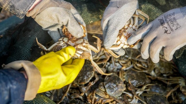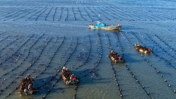1月6日,山东省青岛市即墨区鳌山卫街道渔民在晾晒鱼干。春节临近,山东省青岛市即墨区沿海一带的渔民趁着晴好天气,将捕获的海鱼经过切割、腌制、晾晒等工序加工成鱼干,供应年货市场。