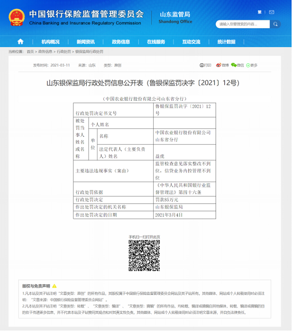 在中国银行保险监督管理委员会官网公布的山东银保监局行政处罚信息公开表显示:中国农业银行山东省分行因“监管检查意见落实整改不到位,信贷业务内控管理不到位”被山东银保监局罚款85万元;中国农业银行济南分行因“通过非房地产开发贷款科目向房地产开发企业发放贷款,个人消费贷款资金违规流入房地产企业和股市”被山东银保监局罚款60万元。(文 曹可凡)
