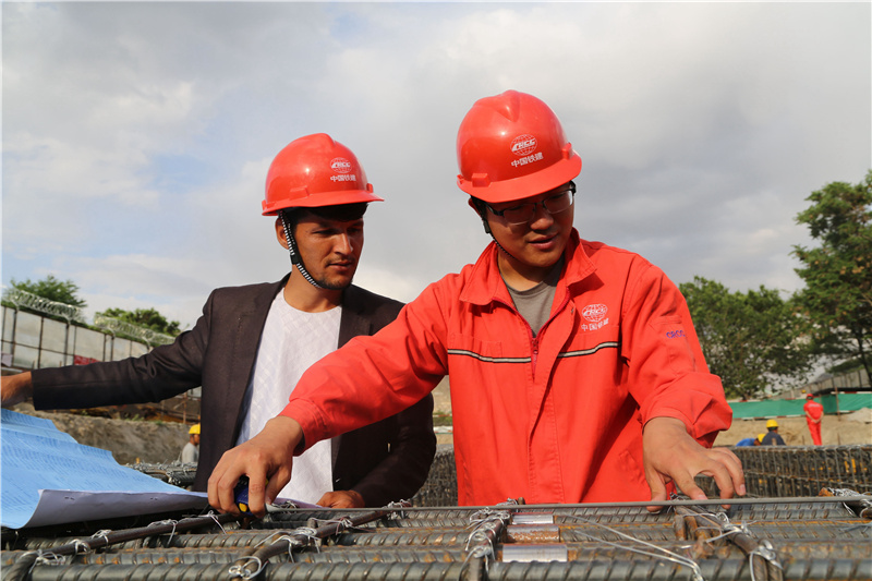 援阿富汗国家职业技术学院项目施工中,中方青年工程师姬宏伟(右)带领阿方员工一同检查工程质量 供图 中铁十四局集团有限公司