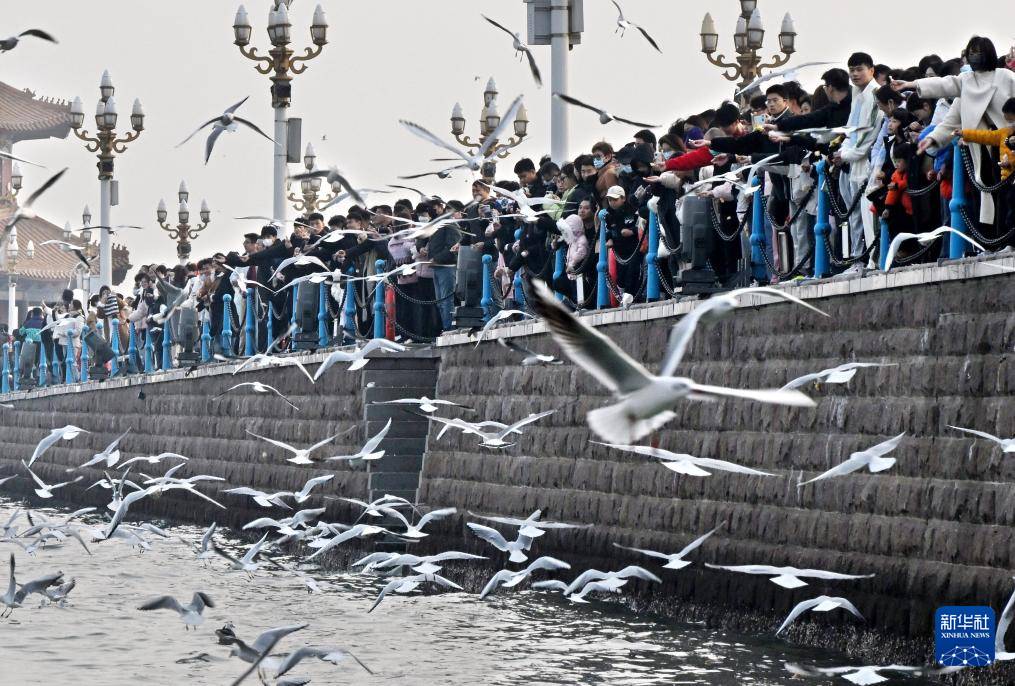 近日,成群结队的海鸥在青岛栈桥低空盘旋、翩翩飞舞,形成了冬日海滨一道独有的风景。每年冬季,数以万计的海鸥从西伯利亚等地飞抵岛城栖息越冬,人鸥和谐共生的画面已成为一张靓丽的城市名片。新华社记者 李紫恒 摄