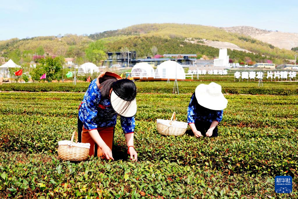 4月16日,在日照市岚山区巨峰镇,茶农在采摘鲜茶。