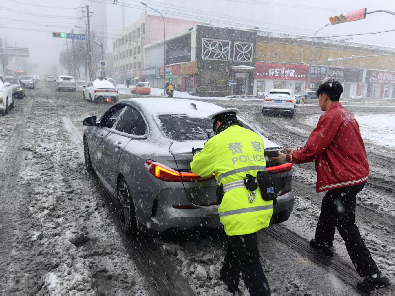 3月2日,济南交警全警上岗,共部署警力1968人,警车628辆,保障群众出行。图为交警对路面车辆伸出援手。 供图 济南交警