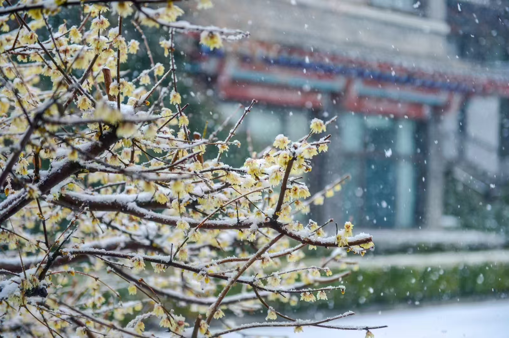 大明湖景区的腊梅花被白雪层层覆盖 摄影 邵凯