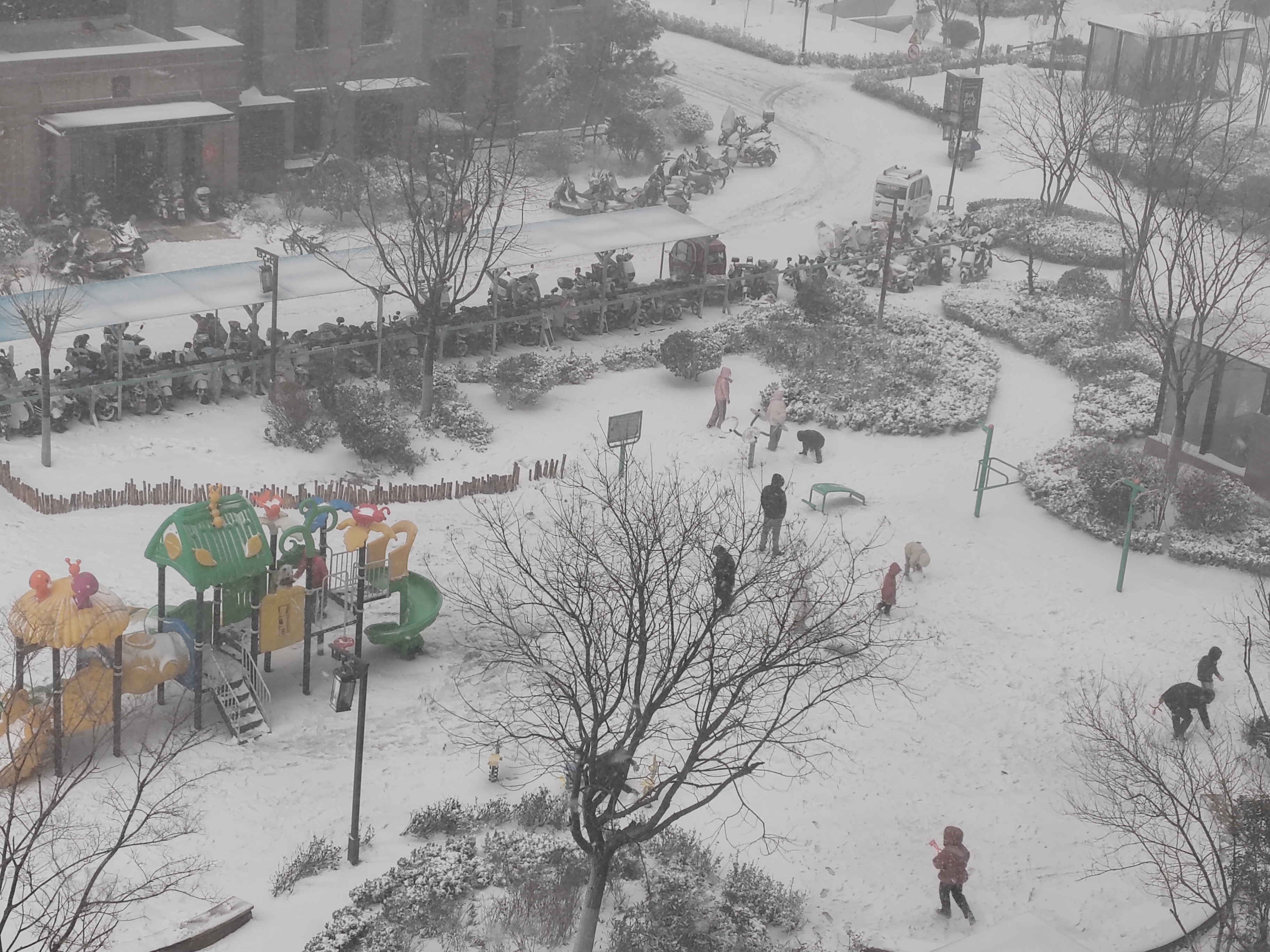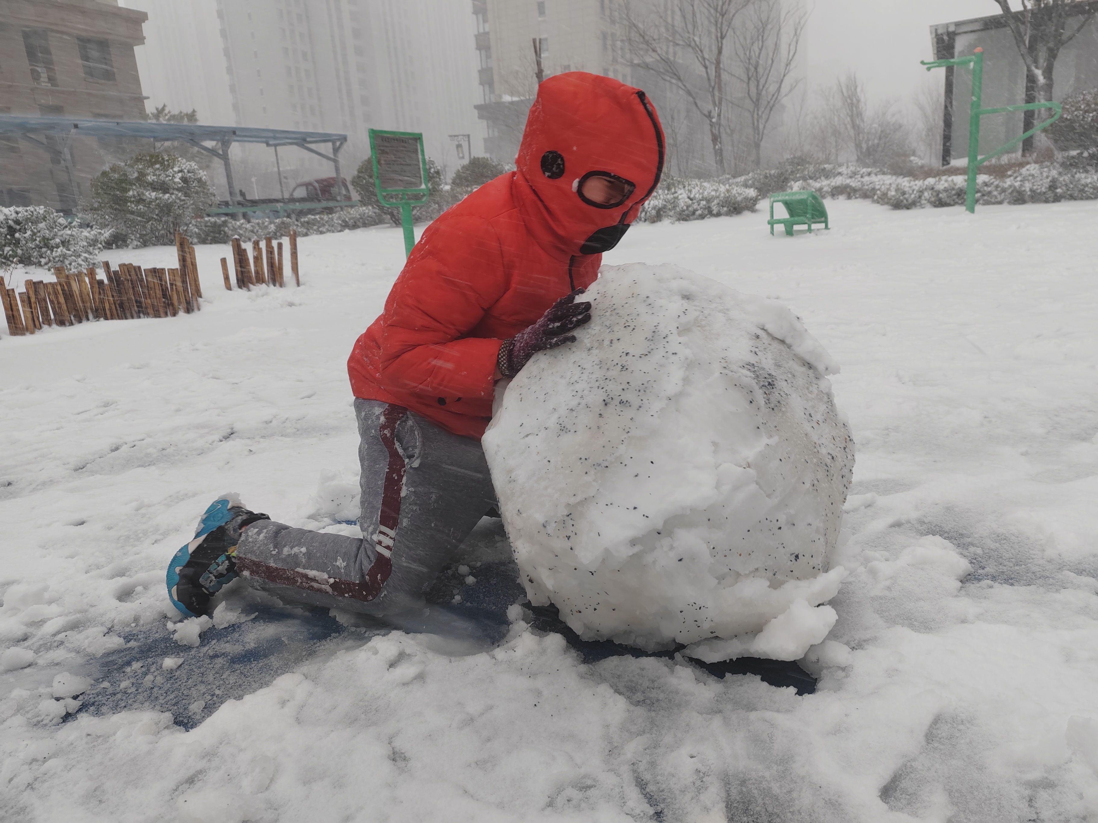 济南市一小区内一片洁白,儿童在兴致勃勃地滚雪球 摄影 侯艳艳