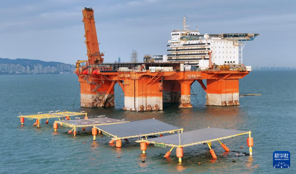 11月19日拍摄的山东烟台高新区海域浮式光伏平台和海上光伏实证基地(无人机照片)。