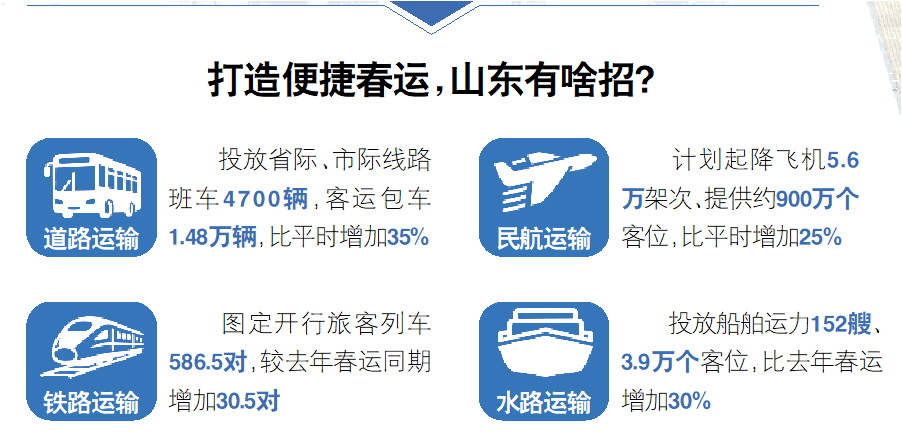 全力打造“便捷春运”,山东强化综合运输组织,科学安排运力投放。道路运输方面,投放省际、市际线路班车4700辆,客运包车1.48万辆,比平时增加35%。