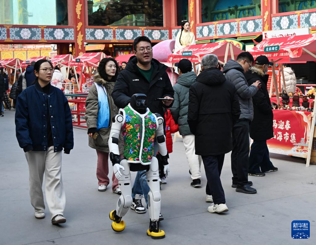 2月10日,在青岛市城阳区山海间不夜城主题街区,一台人形机器人在“逛”非遗大集。新华社记者 李紫恒 摄