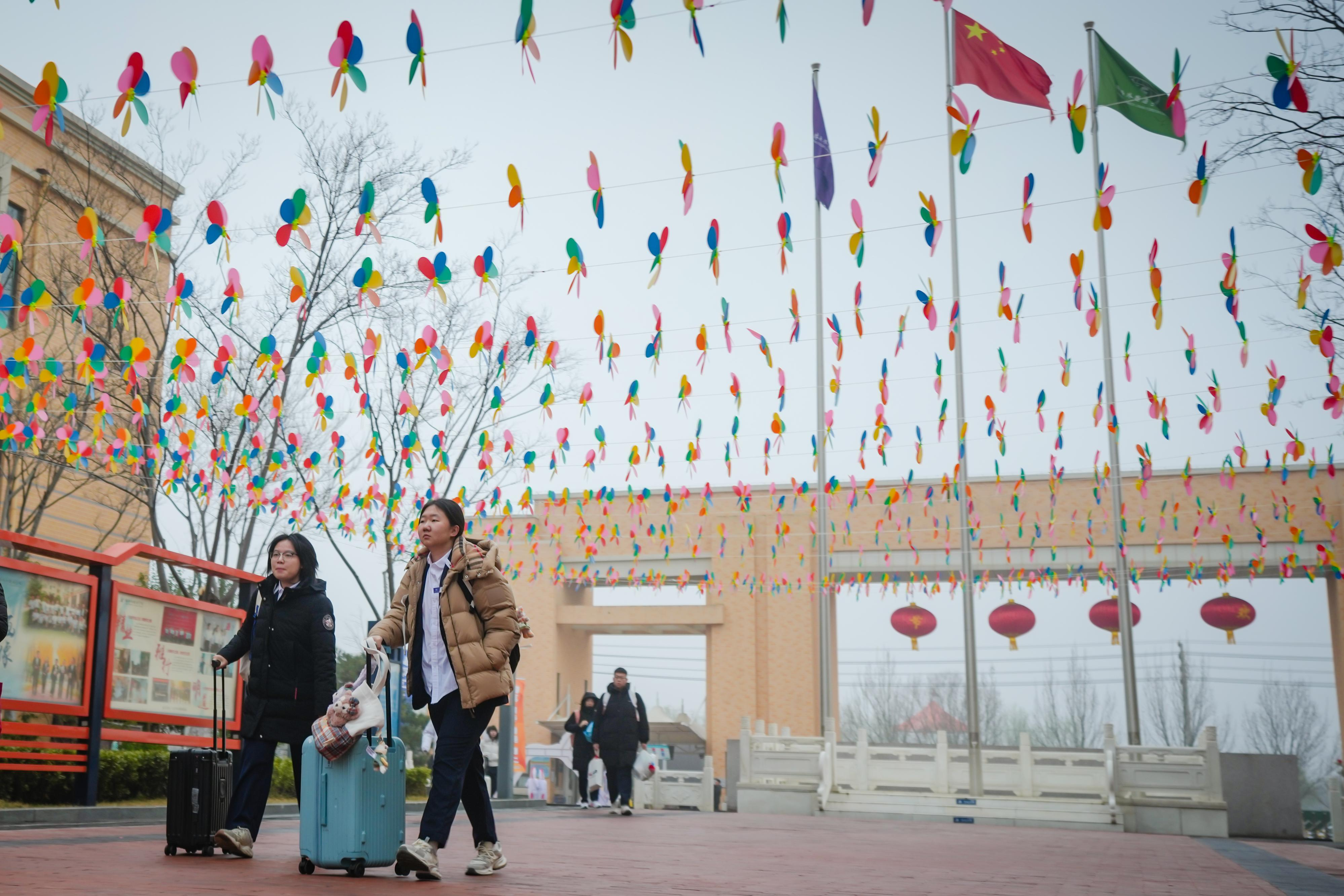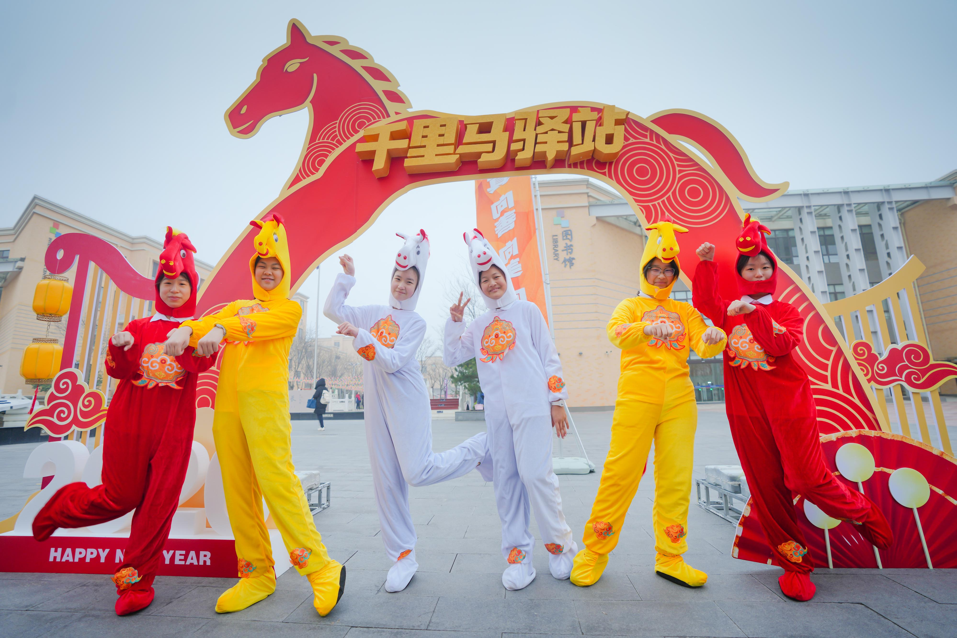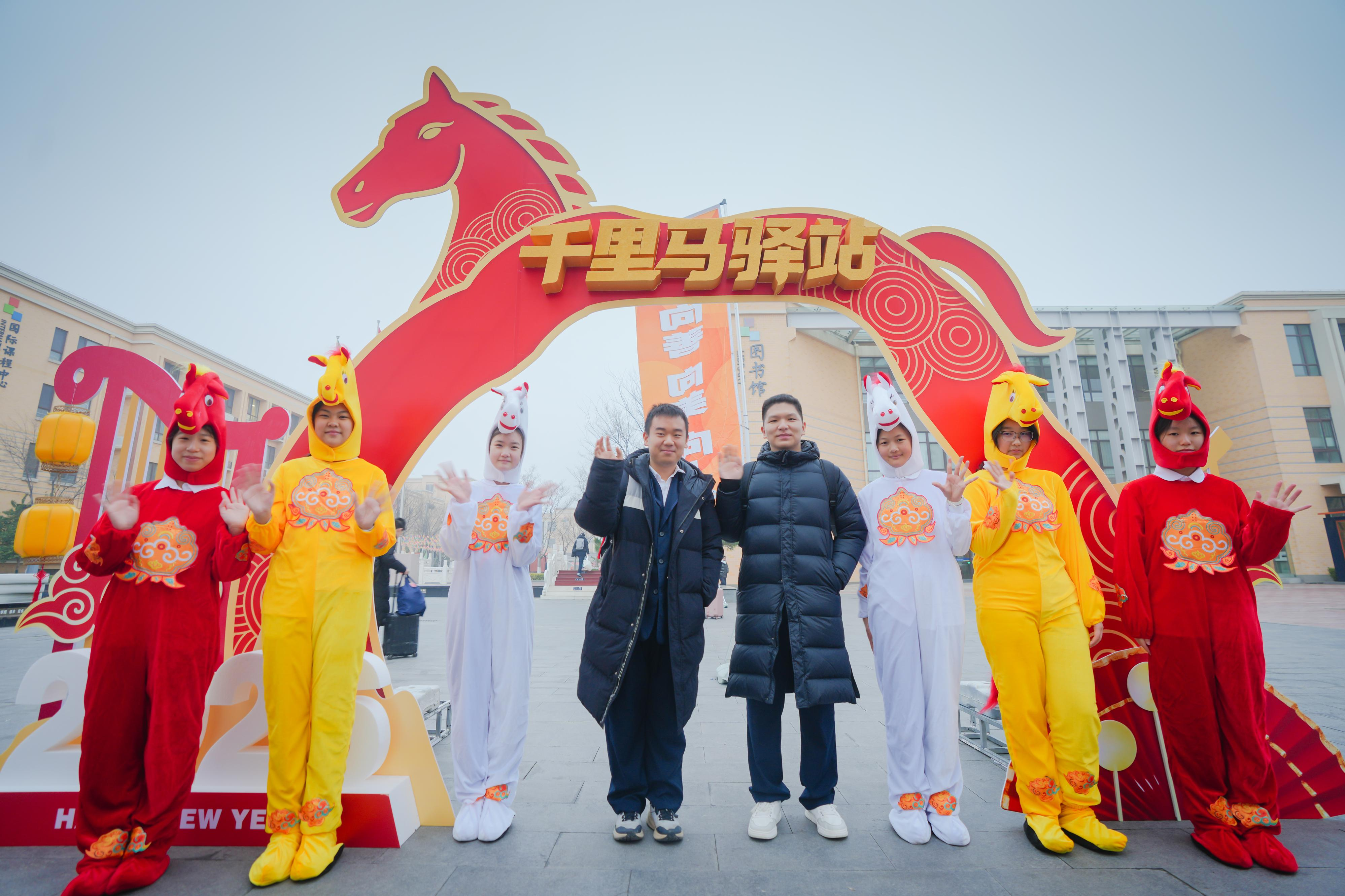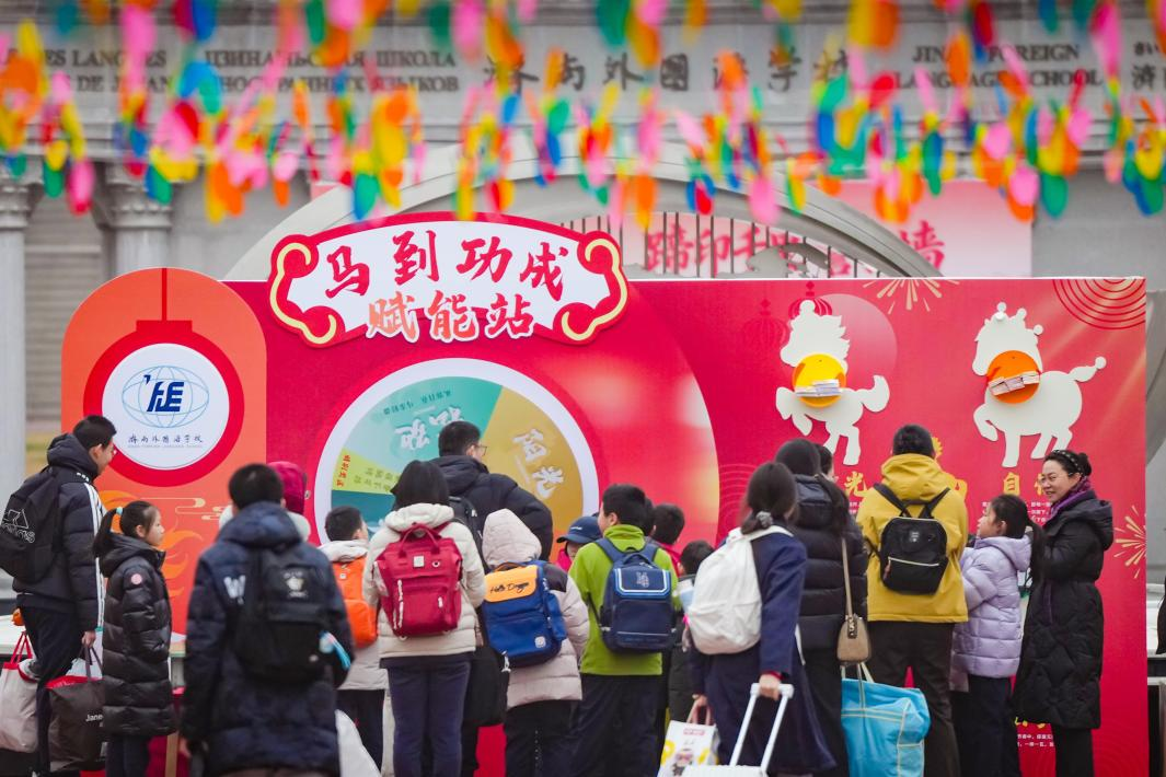 3月4日,济南外国语学校新学期正式开启。学生们清晨踏入南门的瞬间,6只活泼可爱的“小骏马”便映入眼帘——这是啦啦操队的同学身着玩偶服,用热情的舞姿和灿烂的笑容迎接大家返校。校园内还精心布置了多处主题打卡点:“一马当先·启程门”、世界眼广场的“马到功成·赋能站”、老校门的“蹄印千里·誓言墙”,以及锦鲤转盘、多重盲盒等趣味互动环节,等待同学们逐一解锁,也寓意着新学期“一马当先”,奔赴新的青春征程。(文 黄中明)