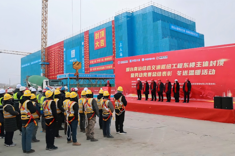 近日,由中建八局承建的烟台南站综合交通枢纽工程东楼主体顺利封顶。