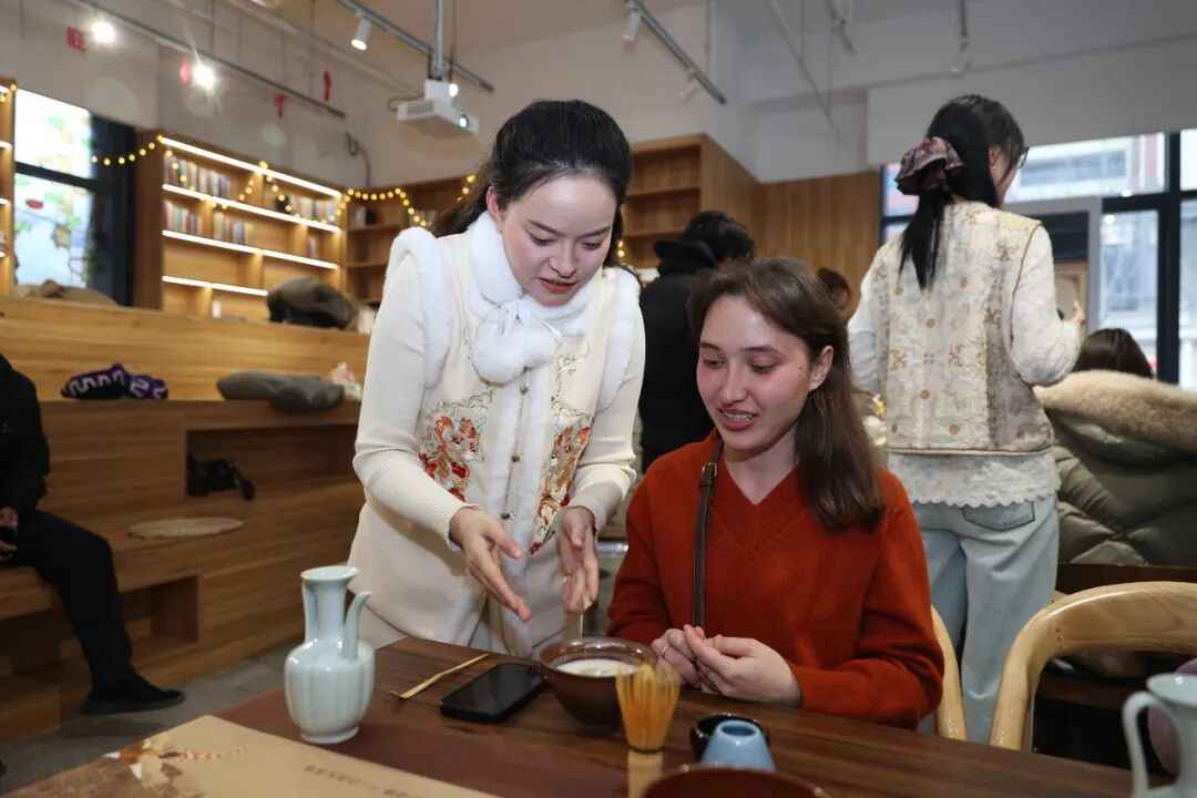 在“千年宋韵·点茶留香”环节,专业茶艺师耐心指导外国友人体验宋代点茶技艺。从认识点茶器皿、研习“七汤点茶法”,到亲手尝试茶沫间的“茶百戏”创作,外国友人以茶为墨、以勺为笔挥毫创作,于茶香氤氲中领略宋人风雅,感受中式美学的独特韵味。