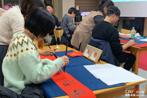 “笔书吉祥”活动中韩国友人用东营“齐笔”书写春联 摄影 李好