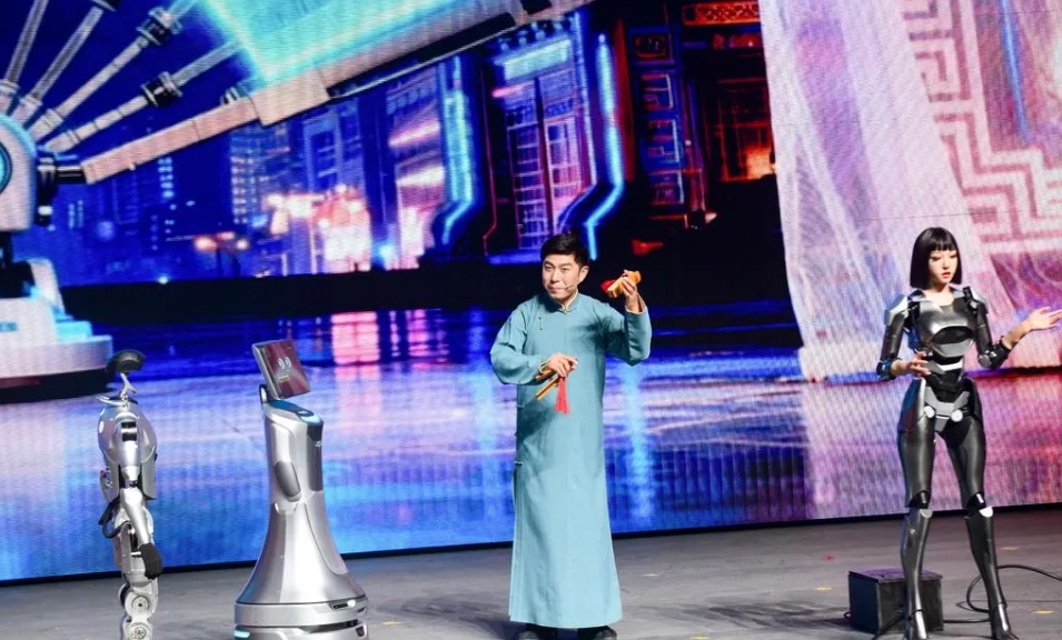 Three robots are performing a crosstalk routine with a crosstalk performer.