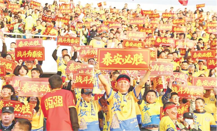 在泰安市体育中心体育场,球迷为主队激情加油。(资料图)
