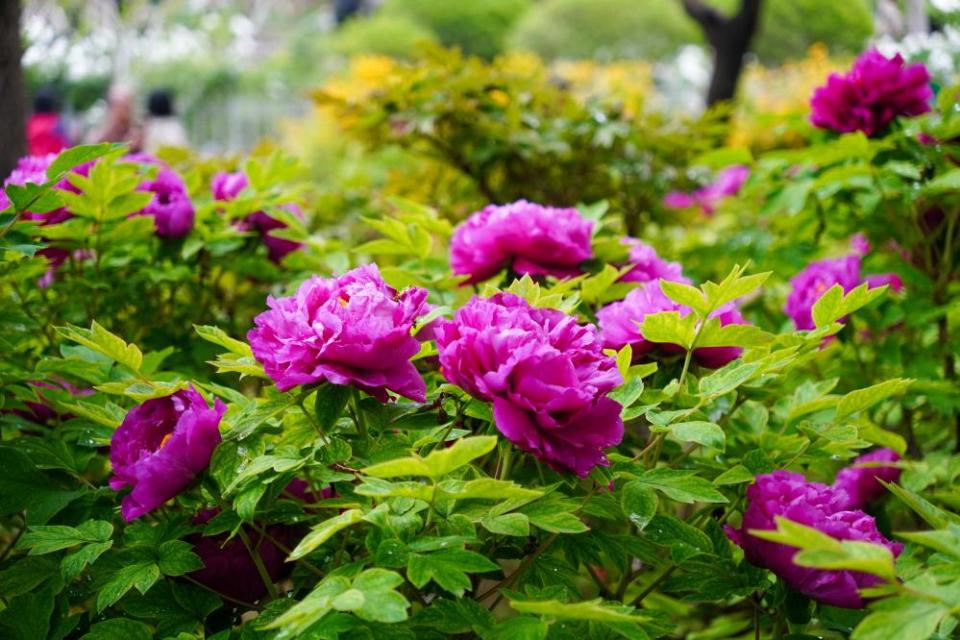 近日,在山东省济南市泉城公园内大面积种植的牡丹花进入盛开期,吸引了众多市民前来观赏。(新华社记者 徐速绘)