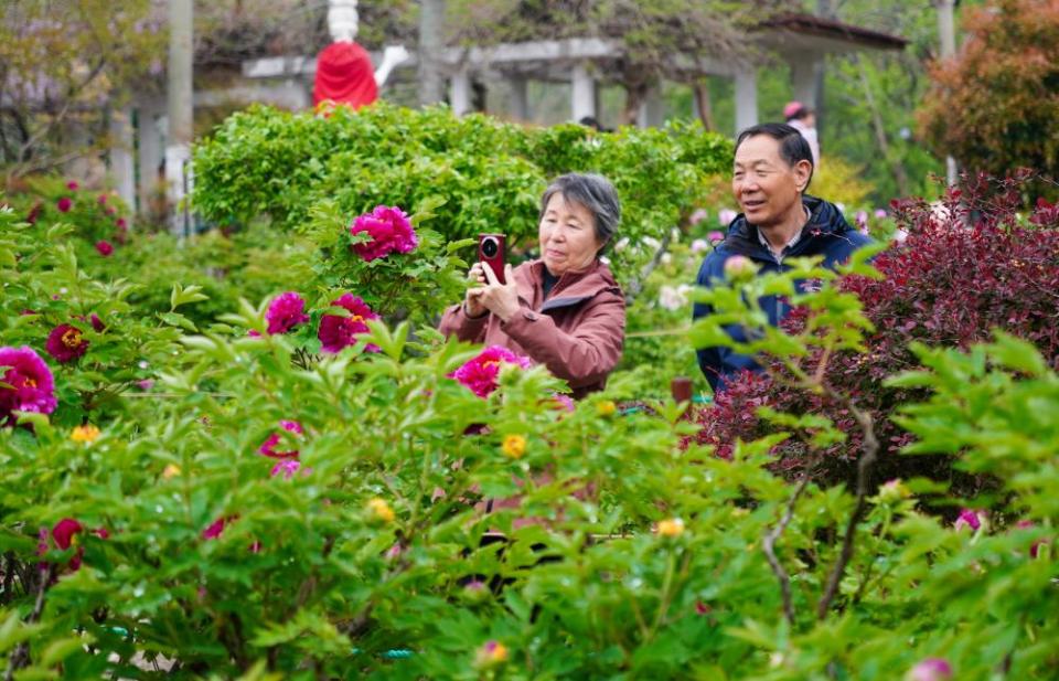 4月9日,摄影爱好者在济南市泉城公园拍摄牡丹花。新华社记者 徐速绘 摄
