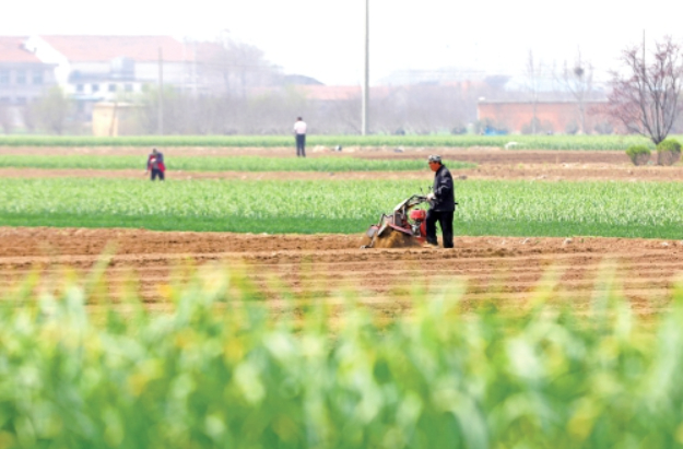 农户操控小型旋耕机翻整土地,为春播做准备。